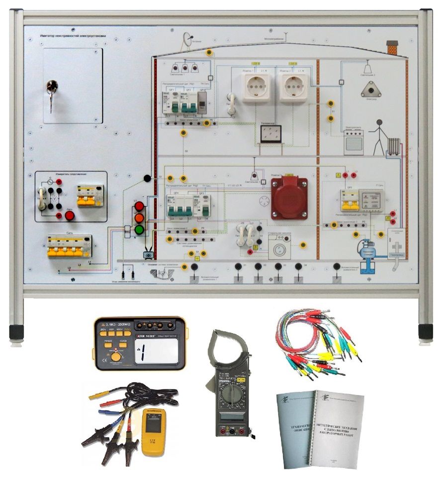 Комплект учебного оборудования «Монтаж и наладка электроустановок до 1000В в системах электроснабжения» предназначен для демонстрации работы электроустановок до 1000В в таких системах электроснабжения как ТТ, TN и IТ. Комплект позволяет имитировать различные неисправности и нарушения в электросети, устройствах коммутации и защиты; неисправности задаются при помощи тумблеров, для ограничения доступа имитатор имеет запирающуюся панель. Комплект позволяет отработать практические навыки и организовать целевое обучение методикам измерения параметров электробезопасности электроустановок и выявления отклонений и неисправностей в электрических цепях и оборудовании, продемонстрировать технические возможности контрольно-измерительного оборудования и тестеров параметров безопасности.